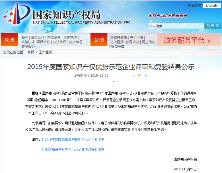 2019年12月11日,经国家知识产权局(国知发运函字〔2019〕245号)公示,确定米乐m6网页版登录入口股份有限公司为2019年度国家知识产权示范企业。