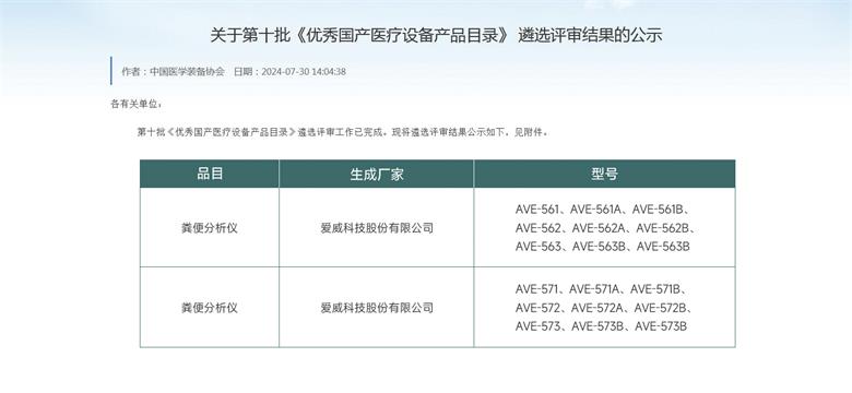 近日,中国医学装备协会官网发布《关于第十批“优秀国产医疗设备产品目录”遴选评审结果的公示》。米乐m6网页版登录入口的 AVE-56 系列全自动粪便分析仪、AVE-57 系列粪便有形成分分析仪在众多参选产品中脱颖而出,再度被评为优秀国产设备。在为数不多的入选品牌中,AVE系列产品型号最为丰富,共入选18个型号,可全面满足各级医疗机构及疾控中心粪便检验需求。